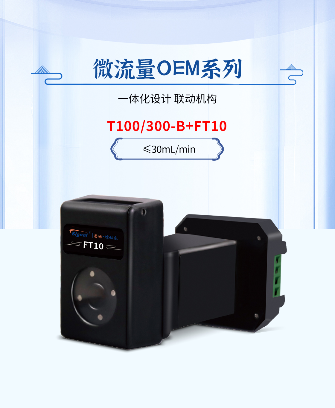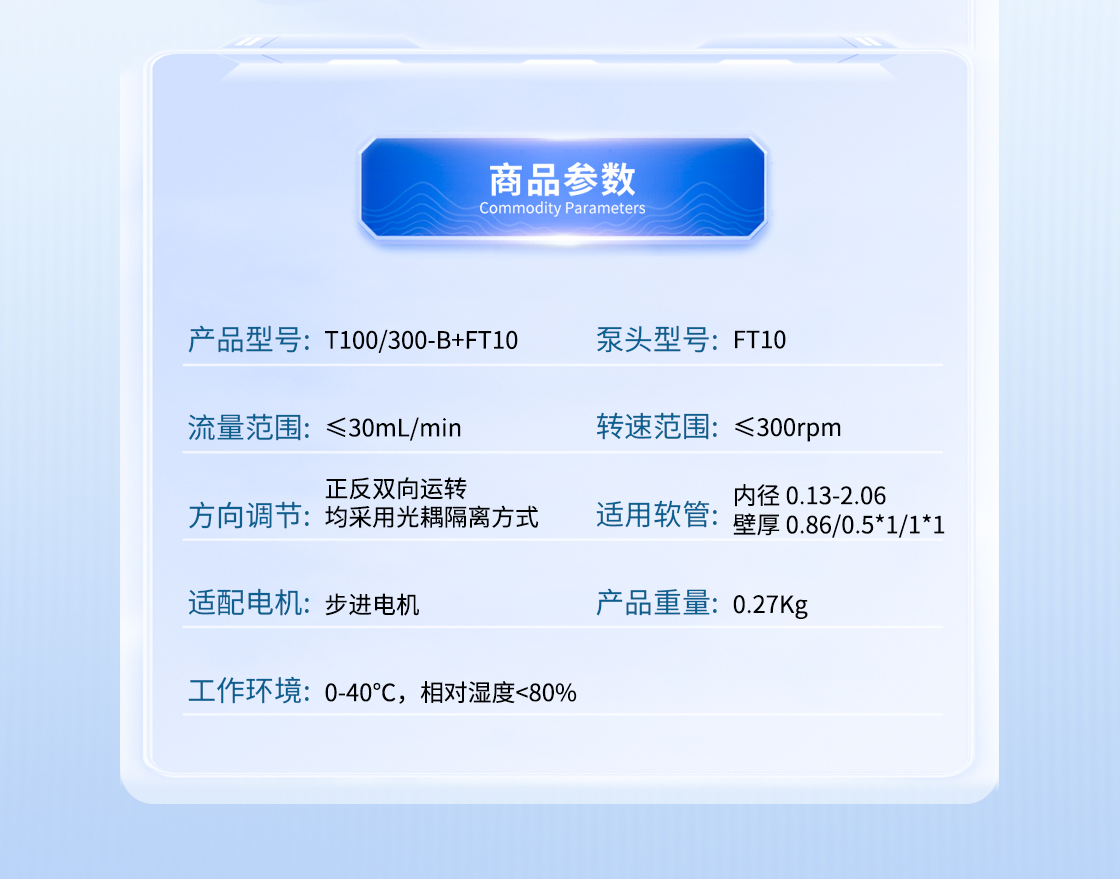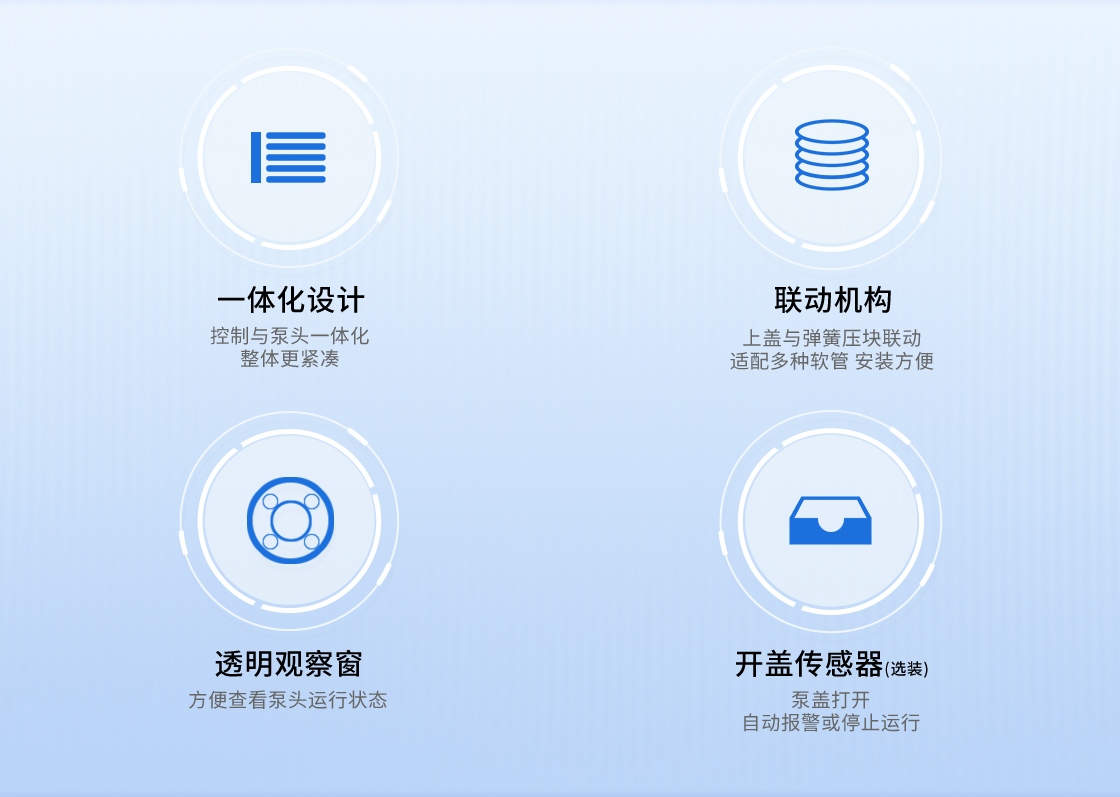 1.流量范圍:<30mL/min 2.控制與泵頭一體化設(shè)計,整體更加緊湊 3.上蓋與壓塊聯(lián)動機構(gòu),安裝軟管更方便 4.彈管壓塊,可適配多種軟管 5.步進電機驅(qū)動 6.透明觀察窗可方便查看泵頭運行狀態(tài) 7.開蓋傳感器(選裝):泵蓋打開,自動報警或:停止運行